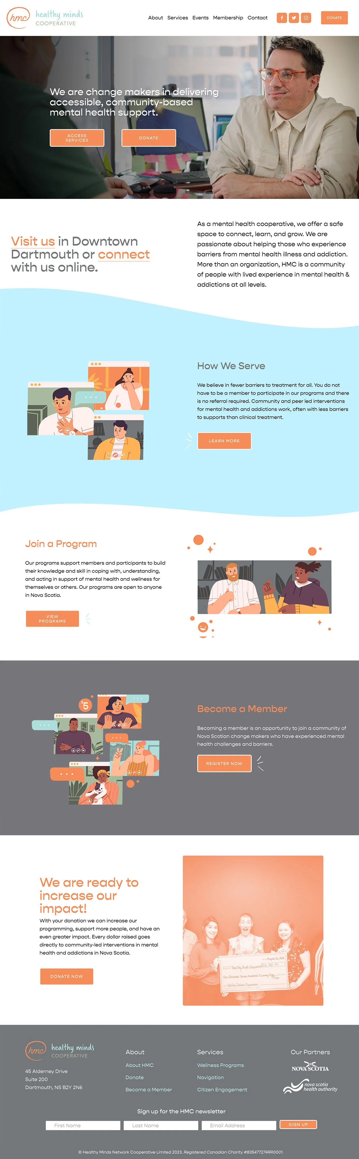 The Healthy Minds team was extremely collaborative during the website redesign process. The board members, staff and volunteers provided input throughout the project and agreed to take some fresh new photos to help make their new website shine. The project focused on making the page more accessible, on brand and inviting to users who needed support. By developing upon their existing brand I altered their existing social media content and applied colour treatments to their photos to help differentiate their events and services.