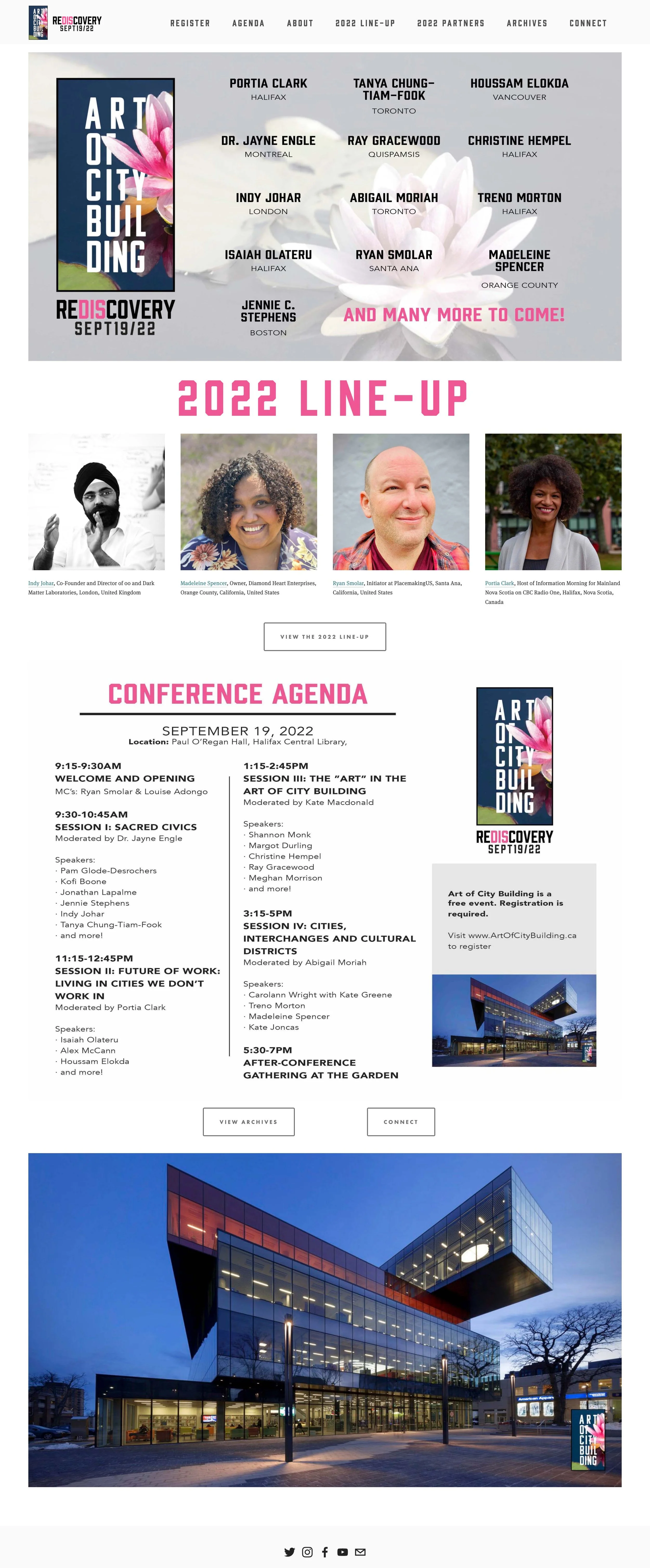 Art of City Building is an annual conference and speaker series that brings experts from all over the world to Halifax, Nova Scotia. Speakers present on various issues such as placemaking, climate crises and inclusion.